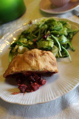 Hier zu sehen; Rote-Bete-Strudel mit Walnüssen und frischer Feldsalat